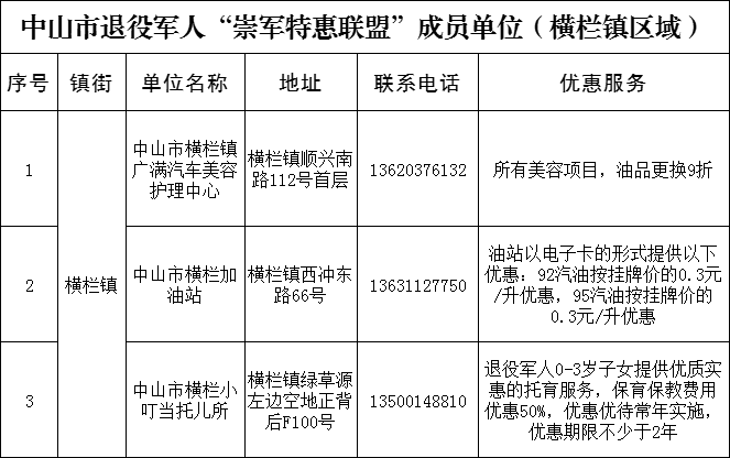 為貫徹落實習近平總書記關于退役軍人工作重要論述精神,加強退役軍人保障工作,我市決定組建中山市“崇軍特惠聯盟”。橫欄鎮迅速行動,以“讓退役軍人得實惠,讓軍人職業受尊崇”為宗旨,秉持“自愿參與、志愿服務、優質規范、合作共贏”原則,分批次招募聯盟成員單位,為廣大退役軍人提供價格優惠產品、優先優待服務。12月2日,橫欄鎮首批3家“中山市退役軍人崇軍特惠聯盟”商家正式掛牌。 橫欄鎮副鎮長程輝、鎮公共服務辦和鎮退役軍人服務中心等負責人分別到橫欄鎮廣滿汽車美容護理中心、橫欄加油站、橫欄小叮當托兒所進行授牌。 據橫欄鎮退役軍人服務中心負責人介紹,凡持有退役證或優待證等有效證件的退役軍人,可到目前市內102個“崇軍特惠聯盟”成員單位享受優惠商品和服務。同時,橫欄鎮將繼續探索擁軍優撫新模式,吸引更多的企業、商家加入“崇軍特惠聯盟”,為退役軍人提供更多更好的服務,增強軍人榮譽感、自豪感,努力營造崇軍的良好社會氛圍,切實為退役軍人辦實事、辦好事、解難事,致敬“最可愛的人”。