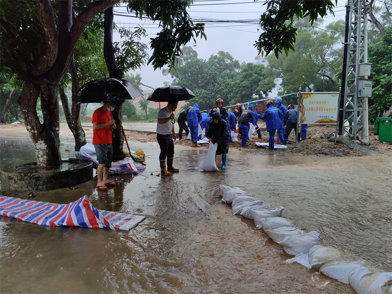▲圖為神灣鎮民兵將沙袋運往內澇道路,用沙袋壘出擋水墻。(通訊員 吳容照 攝)