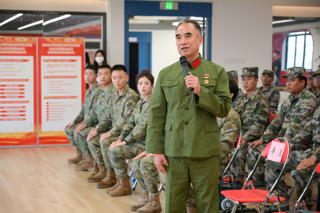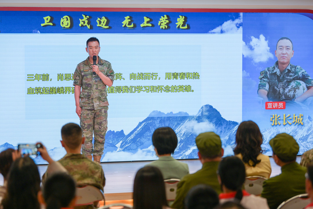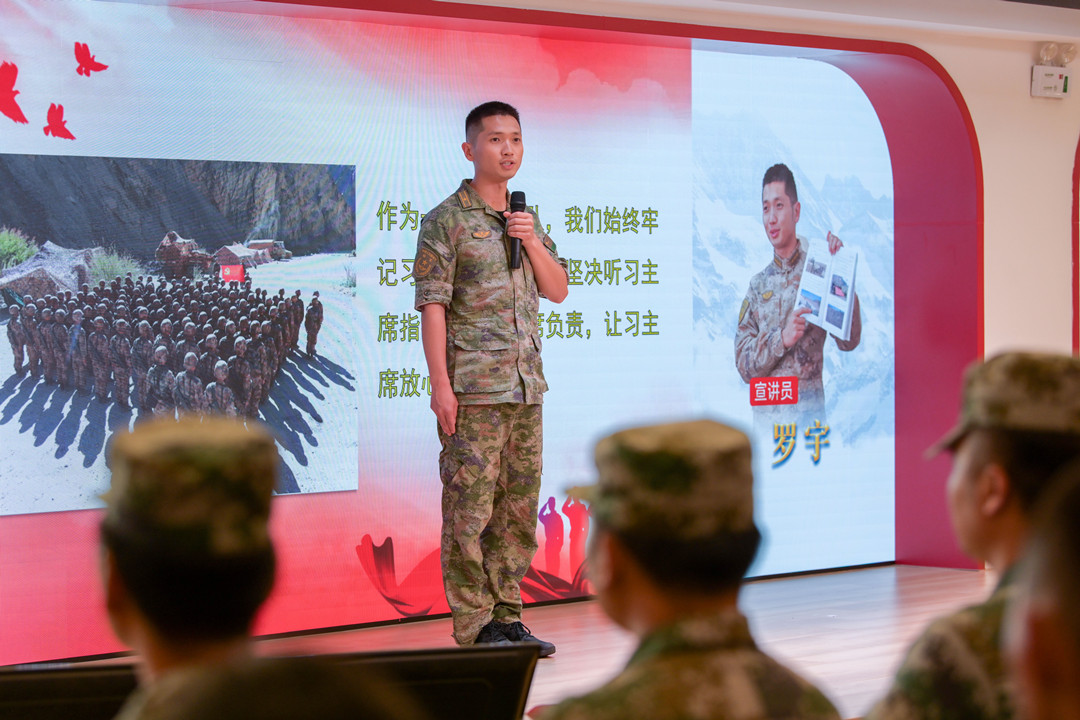 現場,新疆高原69316部隊邊防一營副政治教導員、優秀共產黨員羅宇,中國人民解放軍91878部隊上尉干事郭開強,69316部隊邊防三營五連一班班長張長城3位部隊宣講員激情開講,分享感人的軍旅故事。  羅宇分享軍旅故事。記者 易承樂 攝