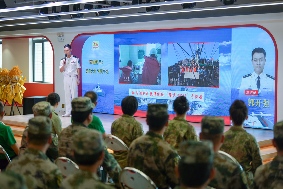 郭開強:勇闖大洋 為國爭光 2008年12月,應聯合國授權請求,奉中央軍委命令,南海艦隊武漢艦、海口艦、微山湖艦組成第1批護航編隊,拉開了人民海軍舉世矚目的亞丁灣、索馬里護航序幕,這是自600多年前鄭和下西洋以來,中國真正意義上的遠海非戰爭軍事行動,開啟了人民海軍從“黃水”駛向“藍水”的壯麗航程。 91878部隊郭開強干事為大家帶來主題宣講《勇闖大洋 為國爭光》。 郭開強介紹—— 迄今為止,人民海軍已累計派出44批100余艘次艦艇參加亞丁灣、索馬里海域護航,完成1500多批7000余艘中外船舶護航任務,解救、接護各類船舶近百艘,其中外國船舶超過50%。 護航官兵一次次直面生死、一次次化解危機、一次次挑戰極限,用忠誠與奉獻、責任與擔當,彰顯大國海軍形象,譜寫了人民海軍邁向世界一流海軍的新時代壯歌。 張長城分享軍旅故事。記者 易承樂 攝