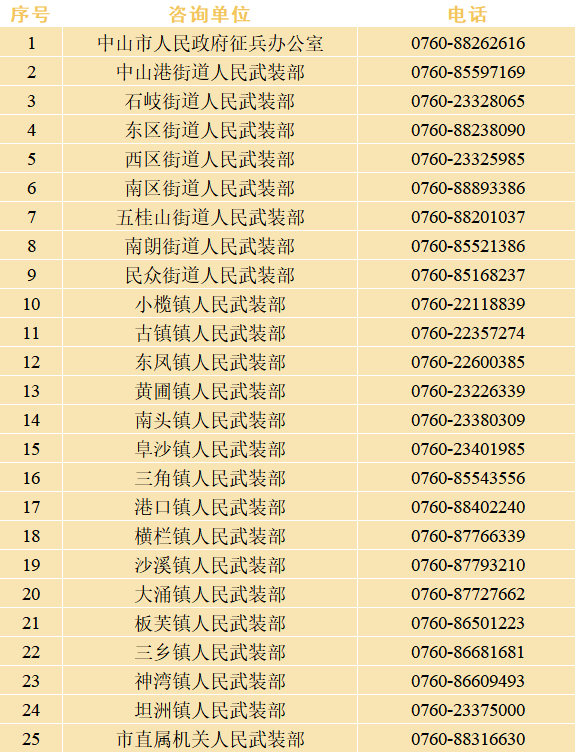 2025年全國征兵(男兵)應(yīng)征報名已于12月1日開始。記者從中山市人民政府征兵辦公室獲悉,即日起,符合條件的青年可通過官方渠道報名參軍,對于征兵政策和流程存有疑問的市民,可通過撥打各鎮(zhèn)街征兵咨詢電話獲得詳細解答。 應(yīng)征報名(男兵) 應(yīng)征報名提示:男兵報名前須完成兵役登記 全國征兵(男兵)2025年應(yīng)征報名時間 上半年應(yīng)征報名:2024年12月1日至2025年2月10日24時 下半年應(yīng)征報名:2024年12月1日至2025年8月10日24時 男兵應(yīng)征報名對象 高中(含中專、職高、技校)畢業(yè)生及以上文化程度的青年(含高校在校生),年滿18至22周歲(2003年1月1日——2007年12月31日出生);普通高等學校本專科畢業(yè)生、上半年符合畢業(yè)條件的畢業(yè)班學生,年滿18至24周歲;研究生畢業(yè)生及在校生放寬至26周歲;初中畢業(yè)文化程度男青年,年滿18至20周歲。 應(yīng)征報名(女兵) 全國征兵(女兵)2025年應(yīng)征報名時間 上半年應(yīng)征報名:2025年1月1日至2025年2月10日24時 下半年應(yīng)征報名:2025年7月1日至2025年8月10日24時 女兵應(yīng)征報名對象 上半年應(yīng)征報名:普通高等學校和科研機構(gòu)全日制應(yīng)屆畢業(yè)生及在校生,年滿18至22周歲(2003年1月1日——2007年12月31日出生),全日制研究生應(yīng)屆畢業(yè)生及在校生放寬至26周歲;2024年普通高等學校全日制本專科應(yīng)屆畢業(yè)生可以報名參加2025年上半年女兵征集,年齡放寬至23周歲。 下半年應(yīng)征報名:普通高中應(yīng)屆畢業(yè)生、普通高等學校和科研機構(gòu)全日制應(yīng)屆畢業(yè)生及在校生,年滿18至22周歲(2003年1月1日——2007年12月31日出生),全日制研究生應(yīng)屆畢業(yè)生及在校生放寬至26周歲。 報名方式 報名方式征兵報名官方網(wǎng)站:全國征兵網(wǎng) www.gfbzb.gov.cn 軍隊媒體移動旗艦客戶端:中國軍號App 中山各鎮(zhèn)街征兵咨詢電話