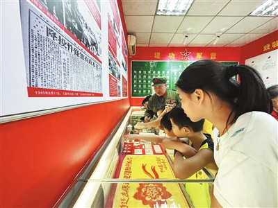 三角鎮老兵翁錦泉在鎮退役軍人服務中心榮譽室向小朋友介紹軍用物品和紀念章。