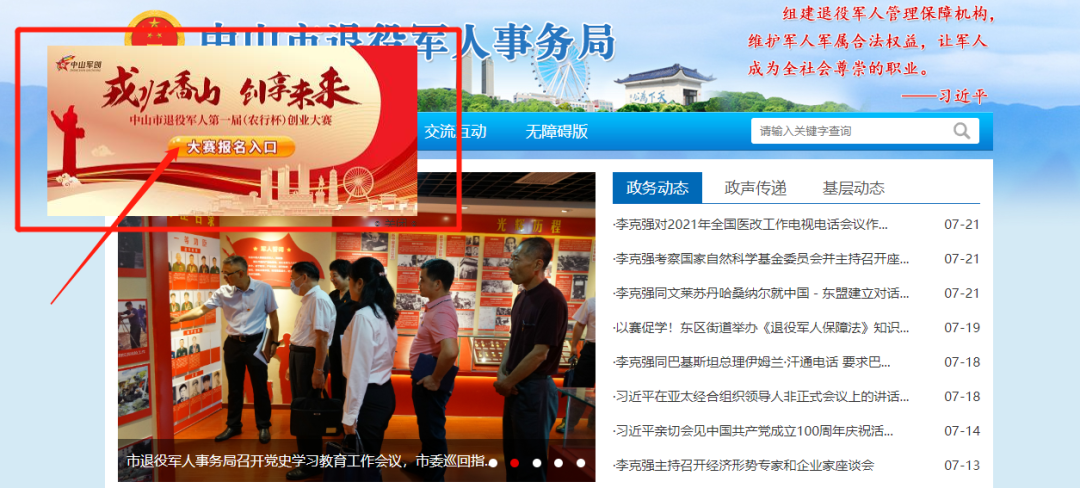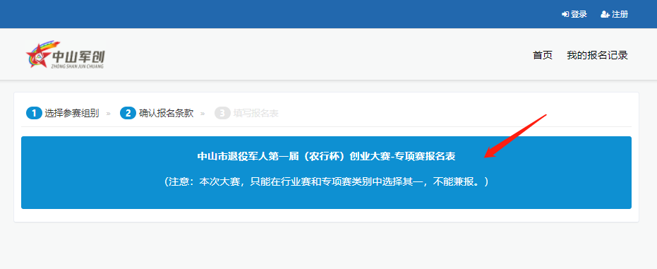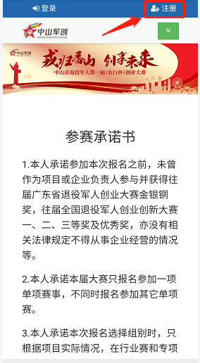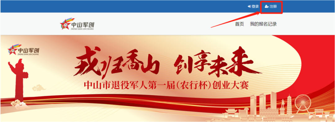 由中山市退役軍人事務局、中山市人力資源和社會保障局共同舉辦,主題為“戎歸香山 創享未來”的中山市退役軍人第一屆(農行杯)創業大賽正在火熱報名中。為幫助廣大退役軍人更高效、準確地報名參加大賽,制作了以下指引,希望對廣大參賽者有所幫助。 中山市退役軍人第一屆(農行杯)創業大賽報名方式有以下三種: 一、官方網站報名 二、微信公眾號報名 三、郵箱報名 官方網站報名 01 登錄大賽官方網站 在瀏覽器輸入網址:http://tyjr.zs.gov.cn/,點擊飄窗【大賽報名入口】進入用戶登錄界面。如圖1所示: