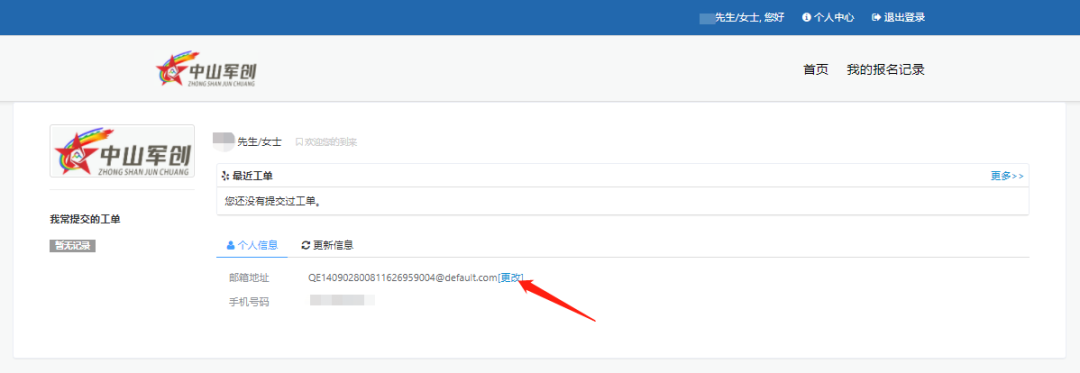 圖4 03 登錄信息 注冊成功后自動跳轉至登錄界面,填寫相應信息后登錄賬號,進入個人中心首頁,將系統默認郵箱更改為個人常用郵箱,方便大賽執委會通知發送。如圖5-6所示: