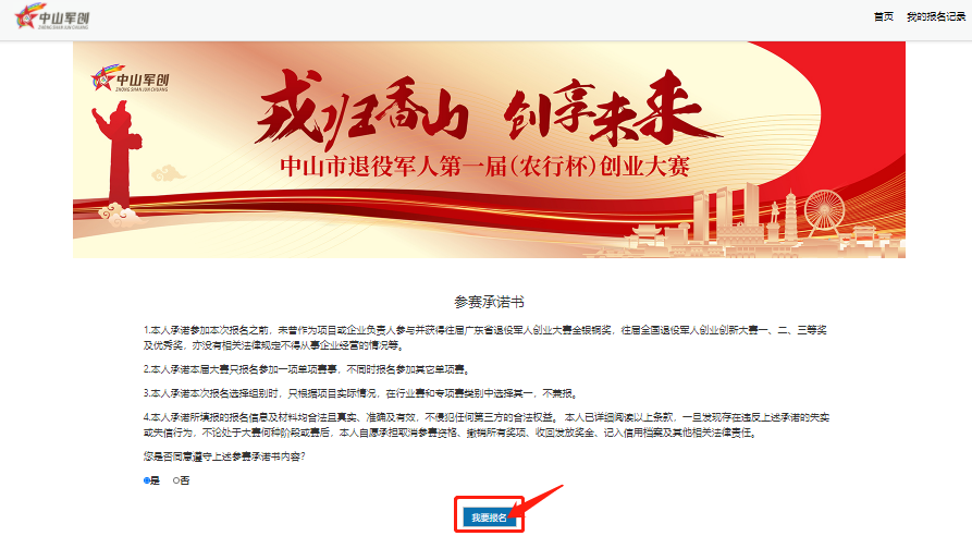 圖6 04 同意參賽承諾書 點擊首頁,跳轉至“參賽承諾書”界面。仔細閱讀參賽承諾書,確認同意后點擊【我要報名】按鈕。如圖7-8所示: