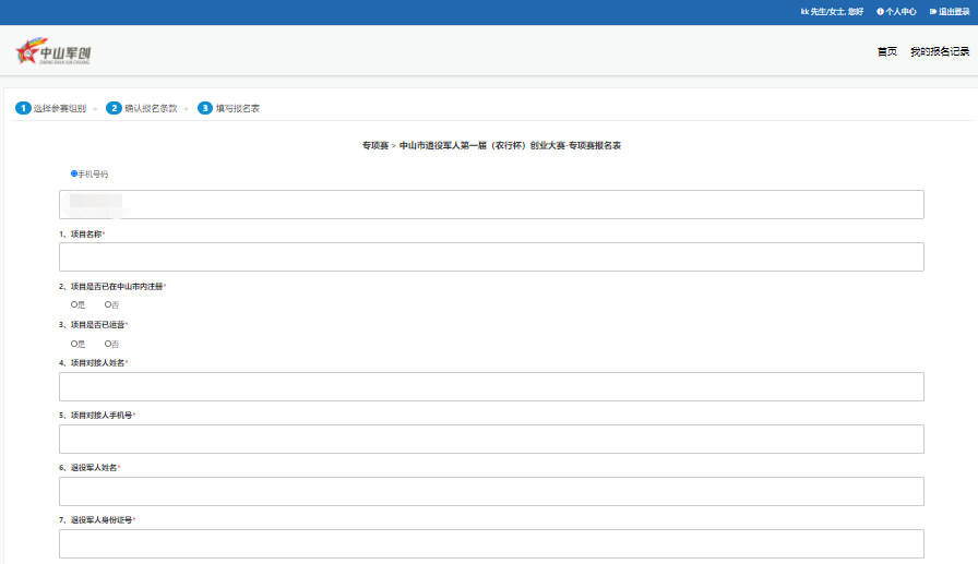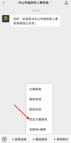 圖16 微信公眾號報名 01關注官方微信公眾號 微信搜索“中山市退役軍人事務局”或者掃描下方二維碼,即可關注公眾號。進入“中山市退役軍人事務局”官方微信公眾號,在下方功能欄找到“便民服務”,點擊選擇“創業大賽報名”即可進入報名系統。如圖17-19所示:
