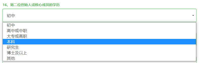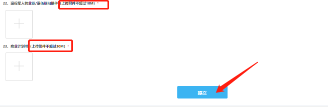 圖10 07 填寫報名表 學歷一欄系統默認為“初中”,如需修改,點擊可跳出其他內容選項,按實際情況選擇即可。注意根據內容提示填寫相應正確信息,有“*”標志的為必填內容,注意退役軍人轉業證/退伍證掃描件上傳附件不得超過10M,商業計劃書上傳附件不得超過30M。報名表所有項目內容格式須完全填寫正確才可成功上傳。如圖11-12所示: