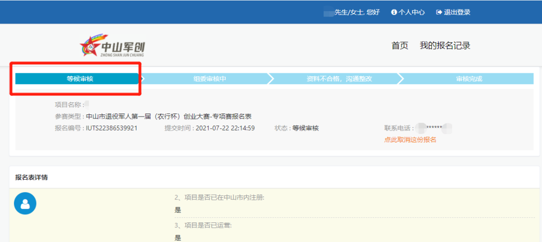 圖12 參賽用戶完成注冊后,點擊【提交】按鈕,即可報名成功,提交狀態顯示為“等待審核”。如圖13-14所示:
