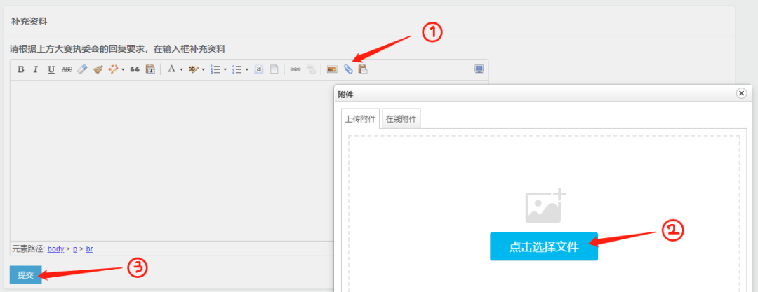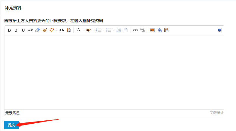 圖14 08 補充資料提交 若想對已提交的報名信息進行補充,可在登陸首頁點擊“我的報名記錄”,點擊【查看詳情】進入報名表詳情頁面,拉至頁面底部的補充資料欄,點擊回形針圖標添加補充文件,再點擊提交即可。如圖15-16所示: