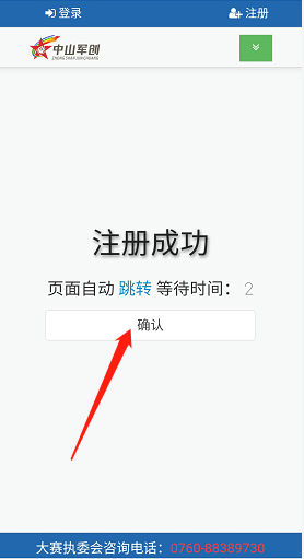 圖19 02 賬號注冊 新用戶進入參賽承諾書界面請點擊右上角【注冊】圖標注冊賬號,在注冊界面填寫設置相應信息,點擊【注冊】按鈕生成賬號,顯示注冊成功后可點擊【確定】按鈕。如圖20-22所示: