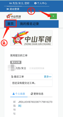 圖23 登錄成功后可跳轉至“個人中心”,點擊右上角綠色圖標可展開菜單欄,點擊【首頁】即可進入“參賽承諾書”確認界面開始填寫報名列表。如圖24所示: 報名列表填寫詳細操作可參考報名方式一“官方網站報名”步驟4-8指引。