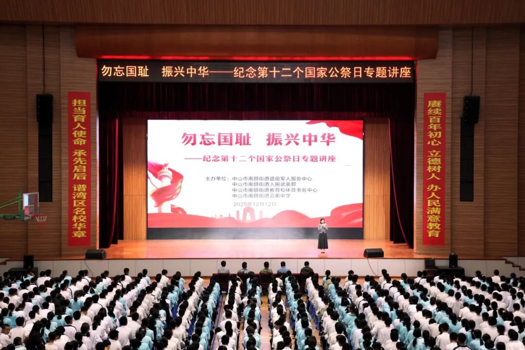 以史為鑒,砥礪前行。在第十二個南京大屠殺死難者國家公祭日即將到來之際,12月12日下午,中山南朗街道人民武裝部、退役軍人服務中心聯合南朗街道教育和體育事務中心在中山紀念中學教育集團云衢中學開展愛國主義教育,700余名師生齊聚一堂,緬懷遇難同胞、傳承愛國精神。