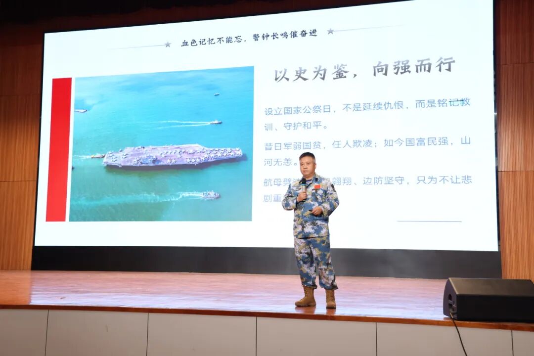 活動邀請中山港口鎮人民武裝部副部長賀洪彪以《銘記歷史守海疆 青春立志報家國》為題開展專題講座,帶領師生重溫南京大屠殺那段山河破碎的屈辱歷史,闡釋國家公祭日的設立意義,讓師生深刻理解“銘記歷史、勿忘國恥”的意義。現場莊嚴肅穆,全體師生為南京大屠殺死難同胞默哀,用無聲的敬意寄托對逝者的哀思。 會上,賀洪彪結合自身十五載南沙守礁經歷,講述“以礁為家、以苦為榮”的崢嶸歲月,用軍人的忠誠與信仰,詮釋新時代國防衛士守護家國的責任擔當,讓師生們真切感受到和平生活的來之不易。