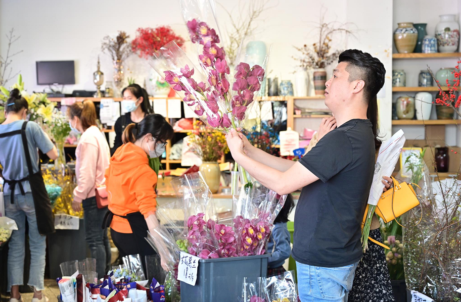 位于東區庫充市場旁的一花店內,鮮艷的花卉綠植擺放整齊有序,各種盆栽年宵花開得姹紫嫣紅。市民梁小姐帶著孩子精心挑選綠植盆栽,“馬上過年了,選購一些小綠植盆栽,給家里增添一些春意、生機,也添一份喜慶。”一旁正在跟店長討教如何養花的王女士也湊上來表示,寓意吉祥美好的蝴蝶蘭、大花惠蘭、銀柳放家中,增加過節氣氛。