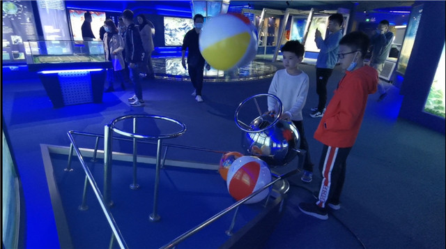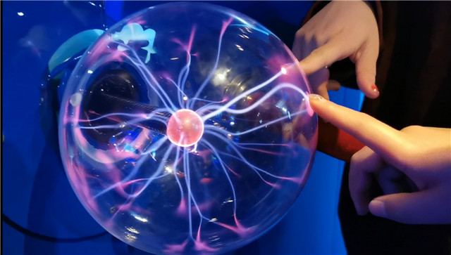 現(xiàn)場(chǎng),講解員還邀請(qǐng)了大家體驗(yàn)觸摸“靜電發(fā)光球”,只見(jiàn)一排“靜電發(fā)光球”固定在墻壁上,玻璃內(nèi)部樹(shù)狀的電弧光不斷變化,伸出手指輕觸玻璃球表面,隨著手指位置移動(dòng)變化,玻璃內(nèi)部的電弧光跟隨手指不斷發(fā)生變化,發(fā)出藍(lán)紫色的樹(shù)狀弧光。與靜電發(fā)光球相對(duì)而放的是“靜電球”,站上特質(zhì)的平臺(tái),雙手觸摸靜電球時(shí),參與者的頭發(fā)絲就會(huì)一根根豎起。