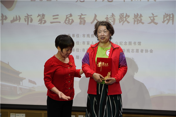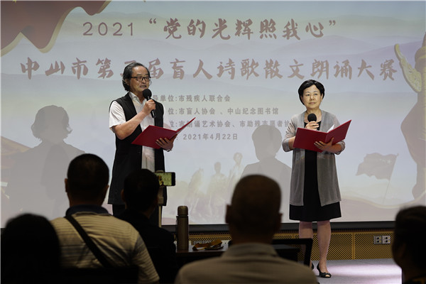 4月22日下午,中山紀(jì)念圖書館報告廳內(nèi),詩意綿綿。“黨的光輝照我心”第三屆盲人詩歌散文朗誦大賽吸引了近20位來自全市各鎮(zhèn)街的盲人報名參加。多位視障朋友帶來了原創(chuàng)作品,歌頌中國共產(chǎn)黨領(lǐng)導(dǎo)下殘疾人事業(yè)得到健康磅礴發(fā)展,視力障礙者的生活質(zhì)量得到顯著提高。來自中山市盲人協(xié)會和市朗誦藝術(shù)協(xié)會的朗誦愛好者還帶來了串場表演。