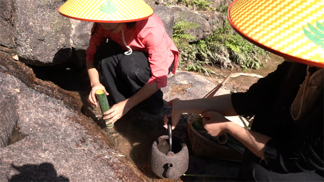 大自然中的午餐,一切都是就地取材。在露營(yíng)基地的竹林砍下新鮮竹子制作竹筒飯。混合著臘腸、糯米、茶葉的竹筒飯?jiān)跓炯苌现丝疽粋€(gè)多時(shí)辰,在此間隙,可把提前準(zhǔn)備好的腌制羊肉用新鮮茶葉包裹好加以燒烤。裹挾茶香的羊肉甘平不膩,竹筒飯也自帶竹葉青的清香。