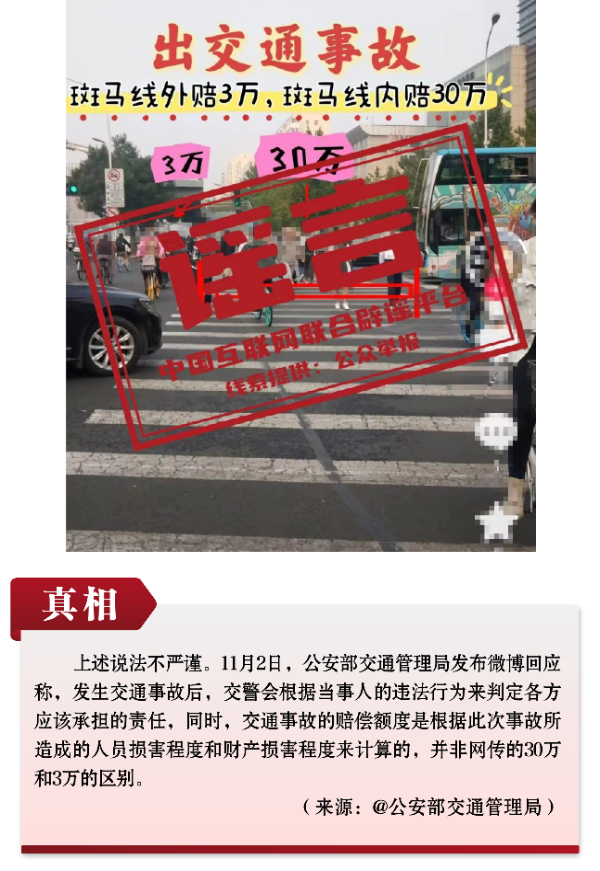 謠言4:行人發生交通事故,斑馬線外賠償3萬、斑馬線內賠償30萬?