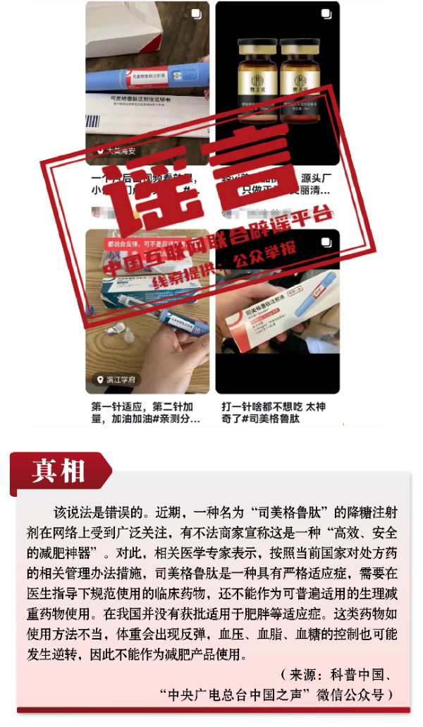 有關呼吸道疾病防治的謠言和誤區誤導公眾。隨著各地陸續入冬,呼吸道疾病進入高發季節,多種呼吸道疾病交織疊加,難免讓人焦慮。恰在此時,網上一些治病養生醫藥“偏方”頻出,一些自媒體假借專業人士和醫生網上“開方”,真假難辨、誤導公眾。如“感染肺炎支原體會得肺炎、會出現‘白肺’”“可自行給孩子服用阿奇霉素等藥物以預防支原體肺炎”“可網上購買‘醫院同款’霧化器在家自療”等謠言,抓住人們對疾病的恐懼心理大肆傳播,有的耽誤正常治療,有的則是“假科普、真帶貨”。此外,“使用司美格魯肽能輕松減肥”的謠言,無視權威部門對處方藥的相關管理辦法措施,此類藥品若盲目使用或者使用不當,存在很大健康風險。