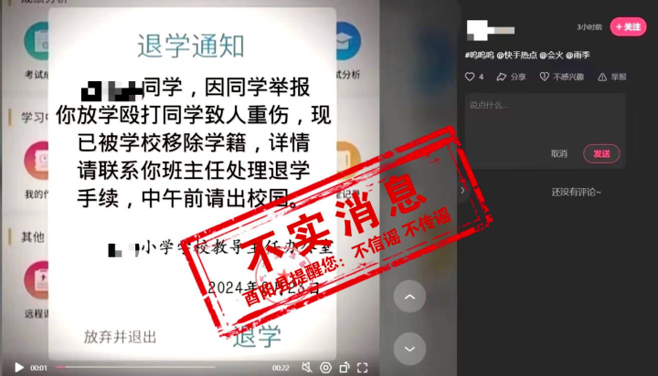 無獨有偶,近期重慶酉陽縣某小學一學生也對這則謠言進行“模仿秀”,在網上惡搞“克隆”出“退學通知”,并以學校名義署名落款。相關謠言在網上傳播后引發議論。目前,這則謠言已被刪除,學校對該學生進行了批評教育。