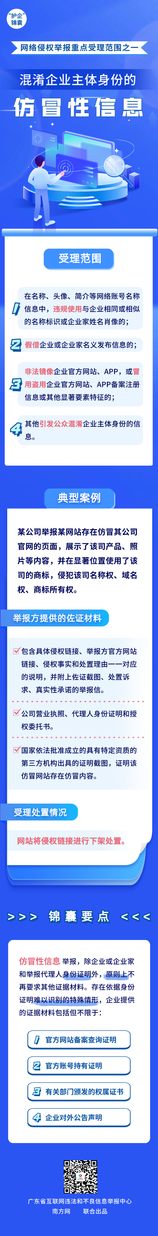 為有效助力企業(yè)維護自身網(wǎng)絡合法權益,廣東省互聯(lián)網(wǎng)違法和不良信息舉報中心精心準備了“護企”錦囊,結合案例帶大家了解涉企網(wǎng)絡侵權信息的重點受理范圍,今天推出重點受理范圍之一——混淆企業(yè)主體身份的仿冒性信息。