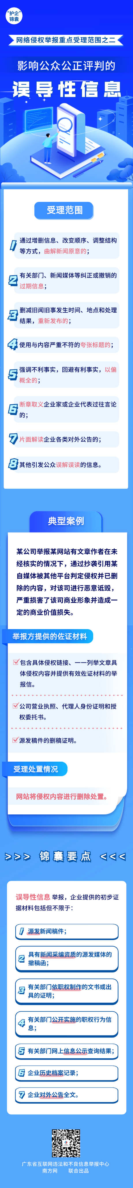 為有效助力企業維護自身網絡合法權益,廣東省互聯網違法和不良信息舉報中心精心準備了“護企”錦囊,結合案例帶大家了解涉企網絡侵權信息的重點受理范圍,今天推出重點受理范圍之二——影響公眾公正評判的誤導性信息。