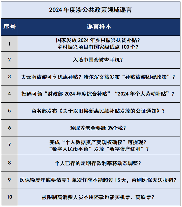 2024年3月,有不法分子冒用國家機關名義,假稱“國家發放2024年鄉村振興扶貧補貼”“鄉村振興項目有國家級試點100個”,以高額返利為誘餌,引誘大量不明真相的群眾加入所謂的各類“基金會”和“項目”,巧立名目騙取錢財。還有自媒體從公開發布的政策信息中摘取碎片化信息,斷章取義,對政策歪曲解讀。如2024年10月,個別自媒體故意混淆“個人養老金”與“基本養老金”的概念,傳播“領取養老金要繳3%個稅”“養老金個稅起征點為5000元”等不實信息,引發公眾誤解。此外,在《國家安全機關行政執法程序規定》和《國家安全機關辦理刑事案件程序規定》公布之際,一些別有用心之人借機造謠抹黑、搬弄是非,大肆炮制所謂“入境中國都會被查手機”的謠言,荒謬至極。