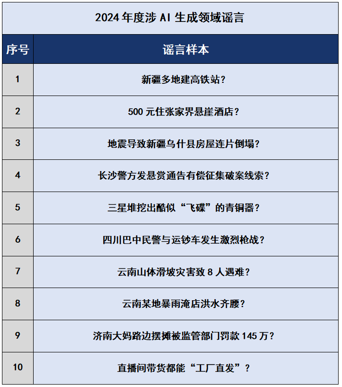 2024年初,“新疆多地建高鐵站”虛假短視頻在網上流傳,此類視頻由軟件智能合成,用戶只需使用指定視頻模板、手動替換涉本人家鄉相關地點的文字即可生成新視頻,利用人們對家鄉基礎設施建設情況的關注而大肆傳播,誤導公眾。還有個別網民為獲取流量和不當利益,利用AI軟件蓄意歪曲“交警請占道停留的運鈔車駛離”的事實,編造謠言“四川巴中民警與運鈔車發生激烈槍戰”,造成公眾恐慌和誤解。此外,謠言“濟南大媽路邊擺攤被監管部門罰款145萬”實為AI工具生成的虛假文章,大肆消費公眾的同情心博取眼球,引發大范圍傳播,造成不良社會影響,相關違法人員被公安機關依法行政拘留。“云南山體滑坡災害致8人遇難”“地震導致新疆烏什縣房屋連片倒塌”“云南某地暴雨淹店洪水齊腰”等謠言則純屬子虛烏有,均為AI特效炮制的虛假視頻,利用公眾對災難事件的重視編造傷亡情況,制造恐慌情緒,擾亂社會秩序。