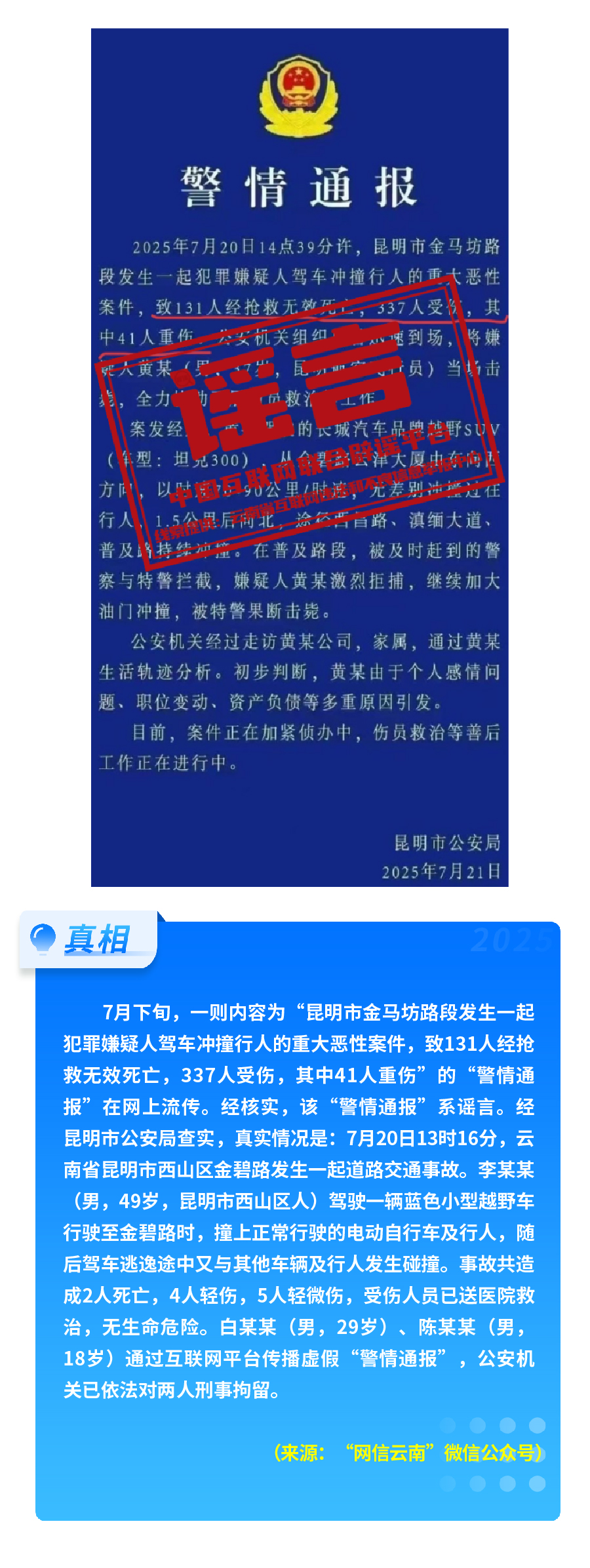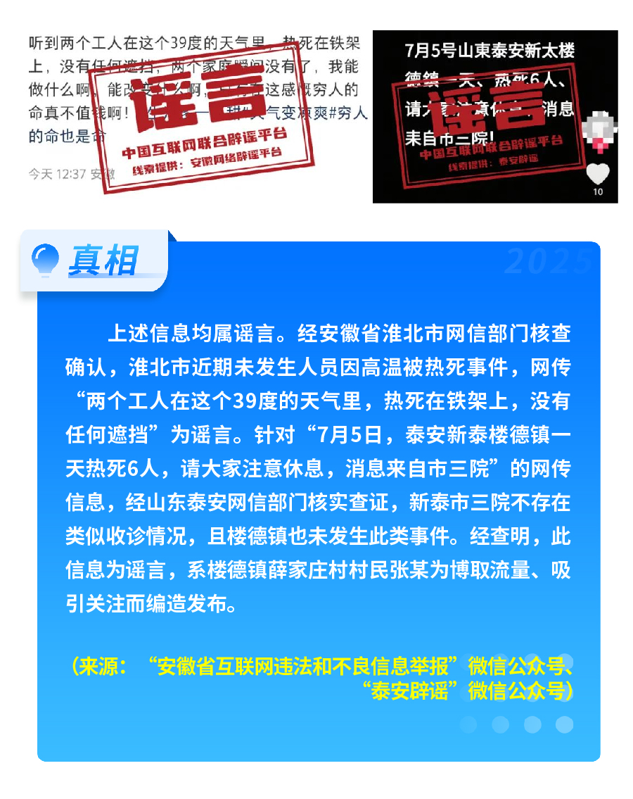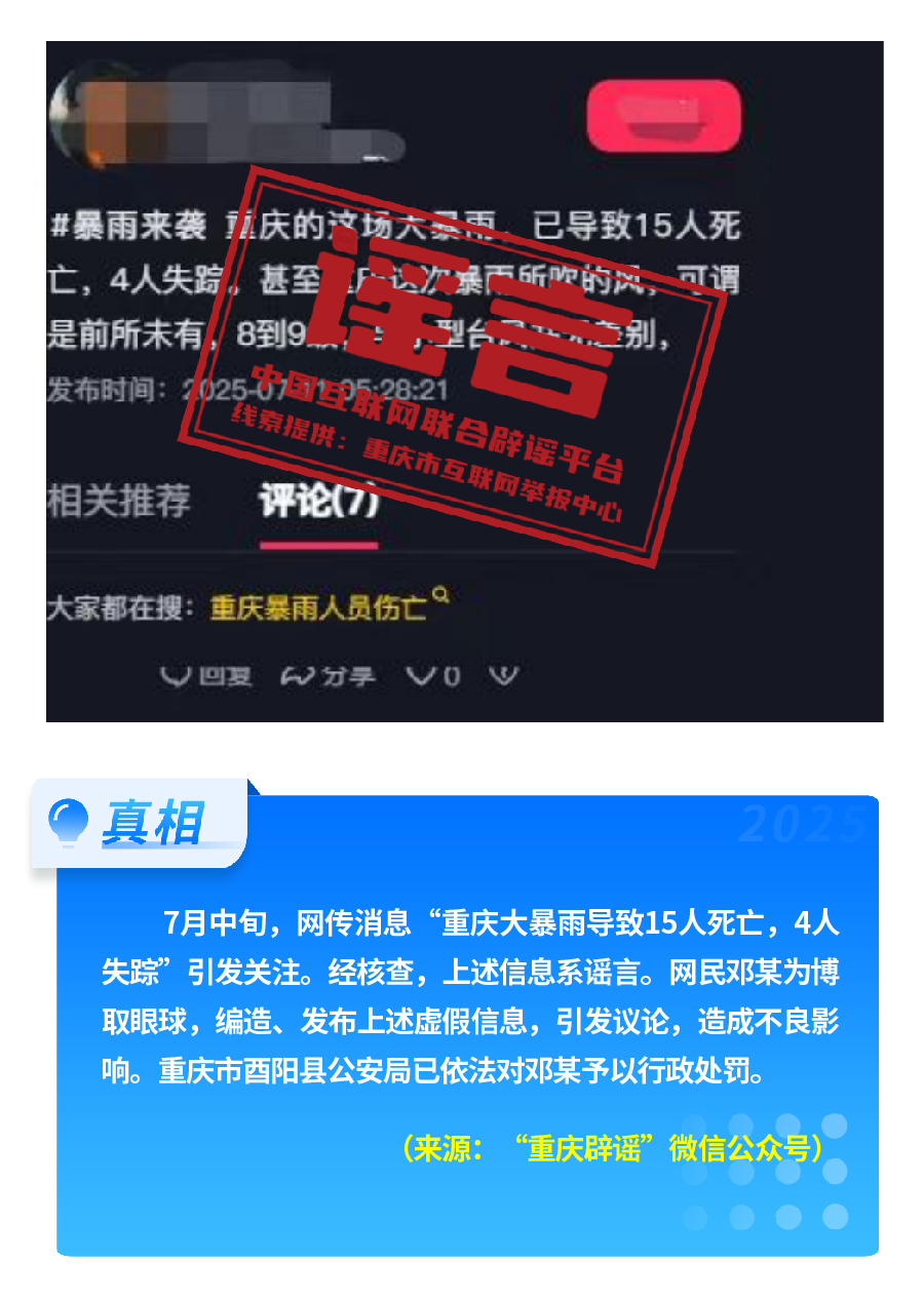 近期,網(wǎng)上接連出現(xiàn)發(fā)布虛假“警情通報(bào)”的惡性造謠傳謠案件,炮制傳播“昆明駕車撞人案131人死亡”“杭州自來水接入糞水”及涉釋永信虛假“警情通報(bào)”,模仿“藍(lán)底白字”格式,杜撰聳人聽聞細(xì)節(jié),損害政府公信力,嚴(yán)重?cái)_亂社會秩序?!霸菏款A(yù)測廣東將發(fā)生8級以上大地震”公然偽造專家聊天截圖,謊報(bào)地震預(yù)警。還有造謠者借盛夏高溫酷暑與洪澇災(zāi)害,編造“安徽淮北、山東泰安等地多人因高溫死亡” “重慶大暴雨導(dǎo)致15人死亡、4人失蹤”等謠言,蹭炒熱點(diǎn)、煽動情緒。