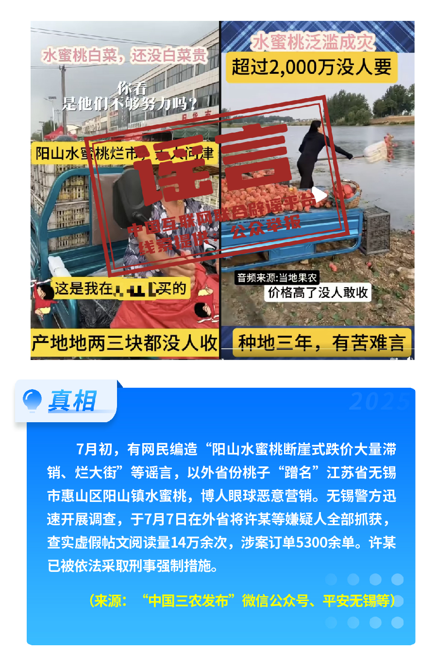 此外,7月份正值暑期旅游旺季和水果等農(nóng)產(chǎn)品收獲季,有自媒體、商家借機(jī)編造傳播涉文旅及農(nóng)產(chǎn)類謠言,干擾市場秩序,侵害消費(fèi)者權(quán)益。有商家違規(guī)使用人民大會堂建筑圖片標(biāo)識和名稱,仿冒人民大會堂賬號,非法售賣、倒賣參觀門票,損害游客權(quán)益。個(gè)別商家剪輯發(fā)布“江蘇無錫陽山水蜜桃斷崖式跌價(jià)、大量滯銷、爛大街”謠言視頻,再借機(jī)兜售假冒的陽山水蜜桃,博人眼球惡意營銷,擾亂市場秩序。所謂“峨眉山人猴大戰(zhàn),游客墜崖,猴王被當(dāng)場擊斃”景區(qū)安全事件一度傳得沸沸揚(yáng)揚(yáng),相關(guān)視頻以驚悚情節(jié)博取關(guān)注,畫面實(shí)際是用AI合成拼接制作。